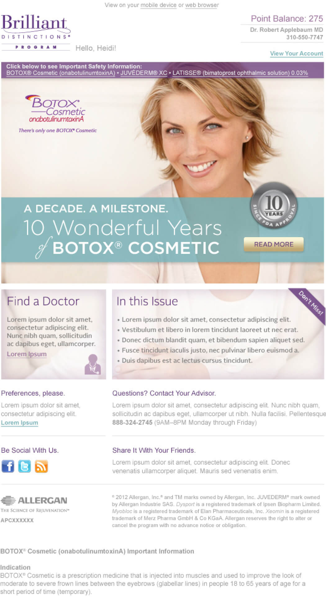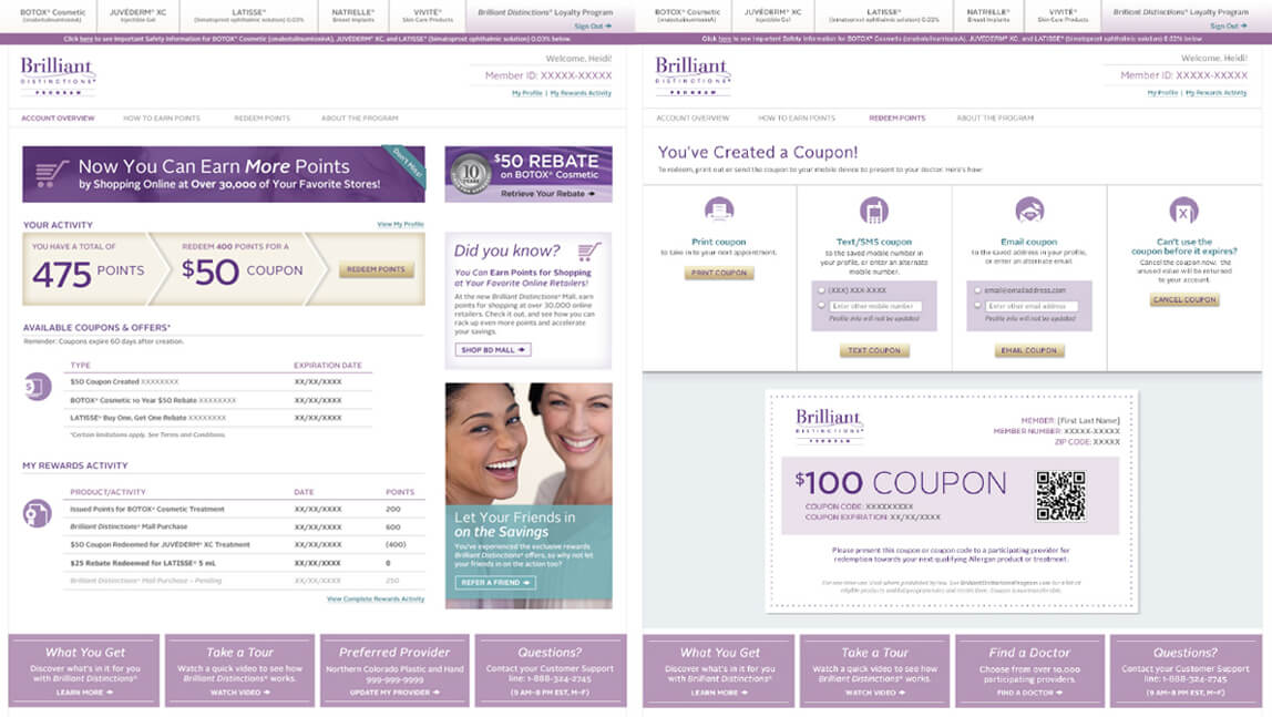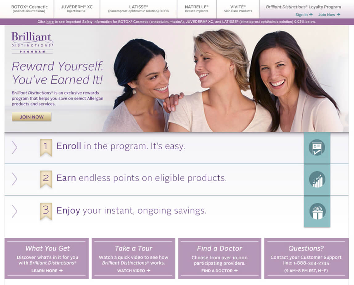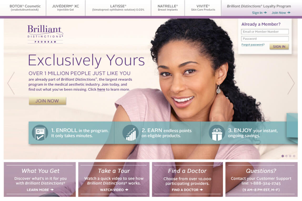 Brilliant Distinctions is the only point-based customer loyalty program of its kind in the pharmaceutical industry. The program was originally developed around Botox but expanded quickly to include other Allergen products. The program was an immediate success, with a business-critical platform with millions of registrants and active points earning members and over 200,000 participating provider accounts.