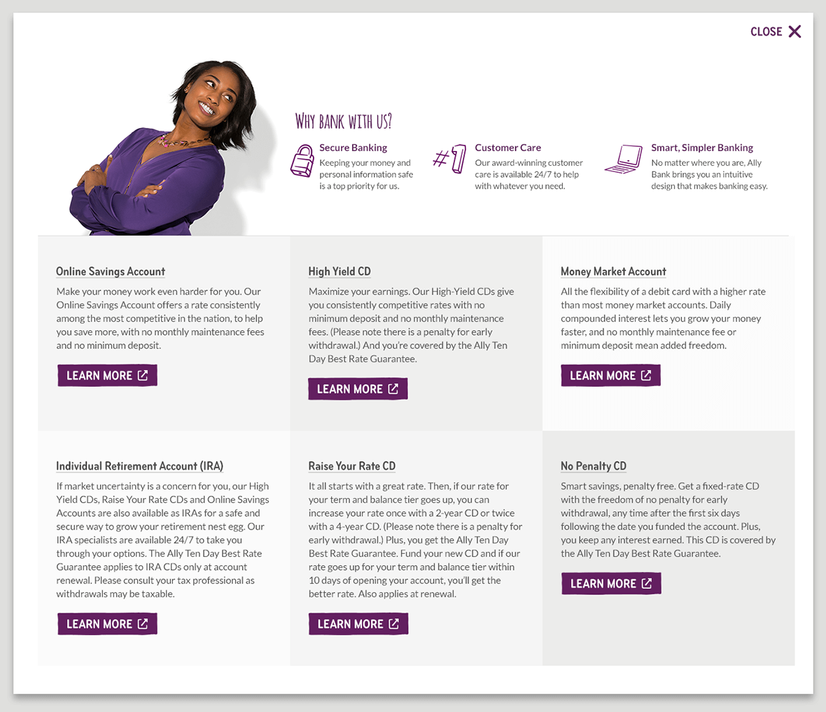 My Ally Connect is a key part of Ally’s overall brand promise of “customer-centric banking.” Each customer receives a highly integrated personal financial gateway that drives relevance, automates content, and optimizes customer lifetime value through enhanced retention and increased product adoption. The program provides Ally customers with personalized information and relevant content that has been mapped to their unique needs based on multiple factors including customer journey, customer data, and Ally-driven business logic.